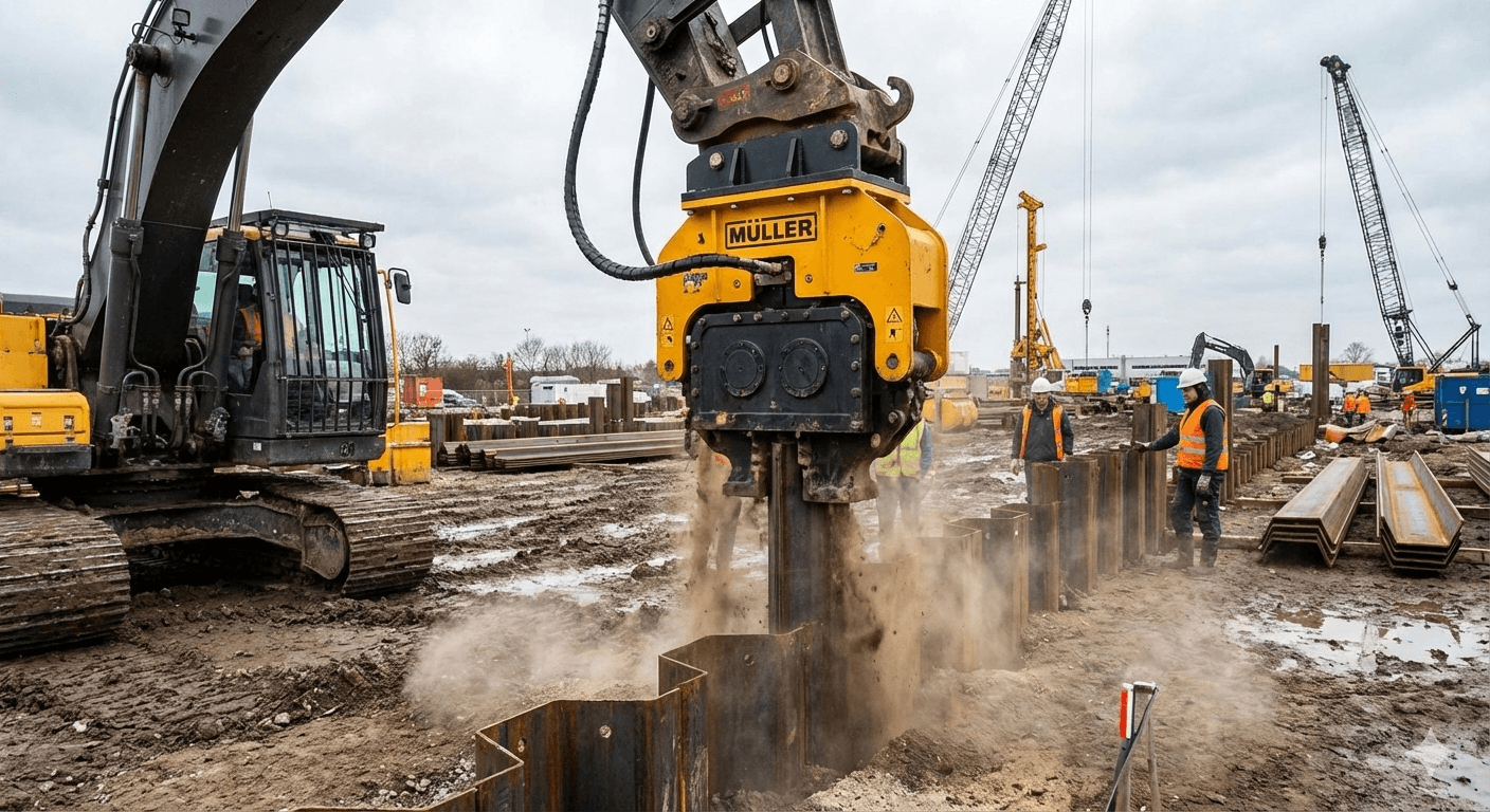 VibroHammerAgilidade Máxima em Fundações: O martelo vibratório utiliza vibrações de alta frequência para reduzir o atrito entre o solo e o perfil, permitindo que a estaca penetre no terreno com rapidez e precisão cirúrgica.